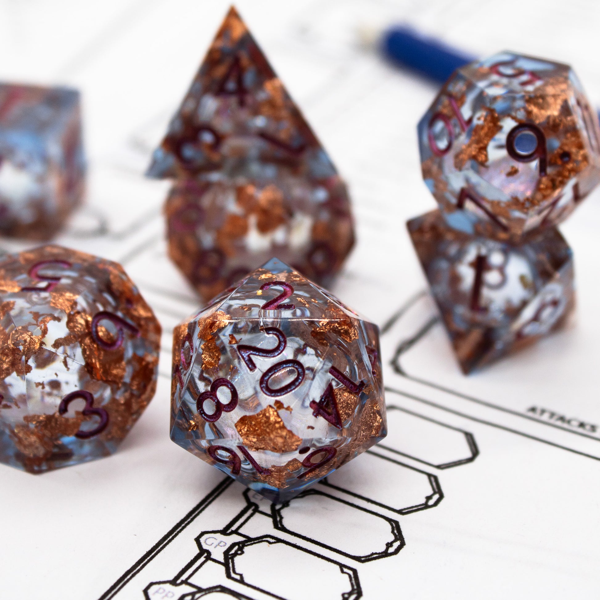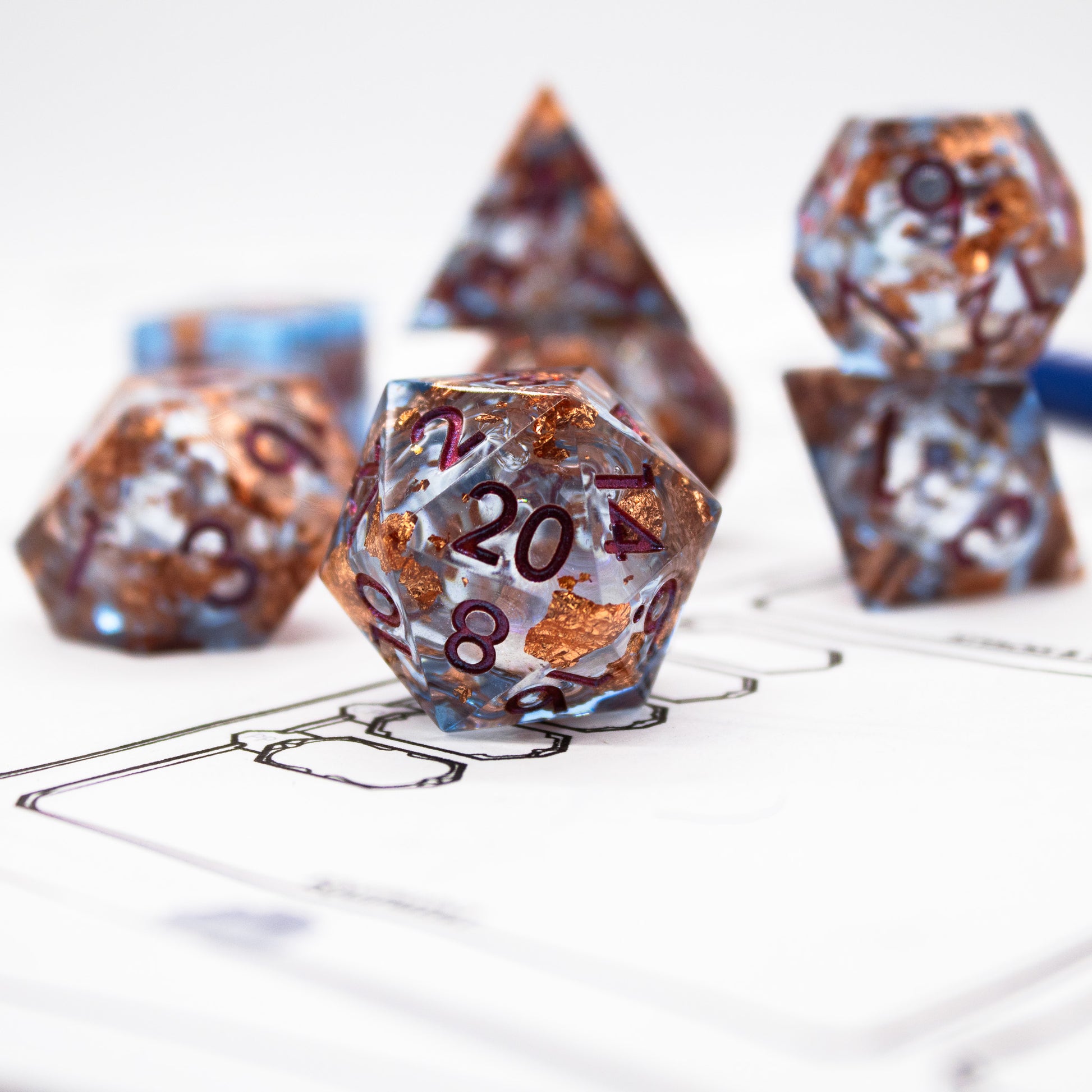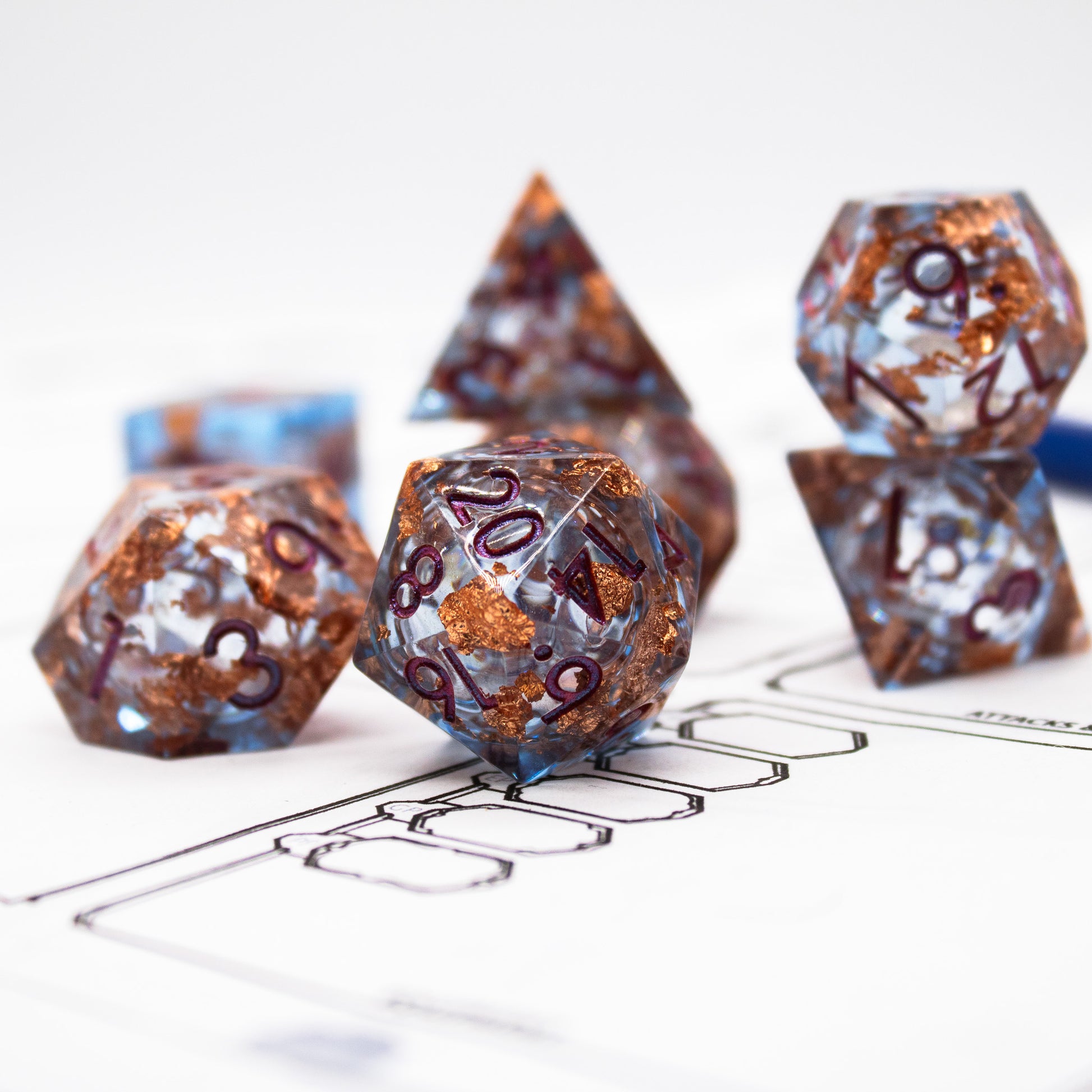Our favorite liquid core set! Each die in this full seven piece set contains a swirling liquid core and copper foil inclusions!