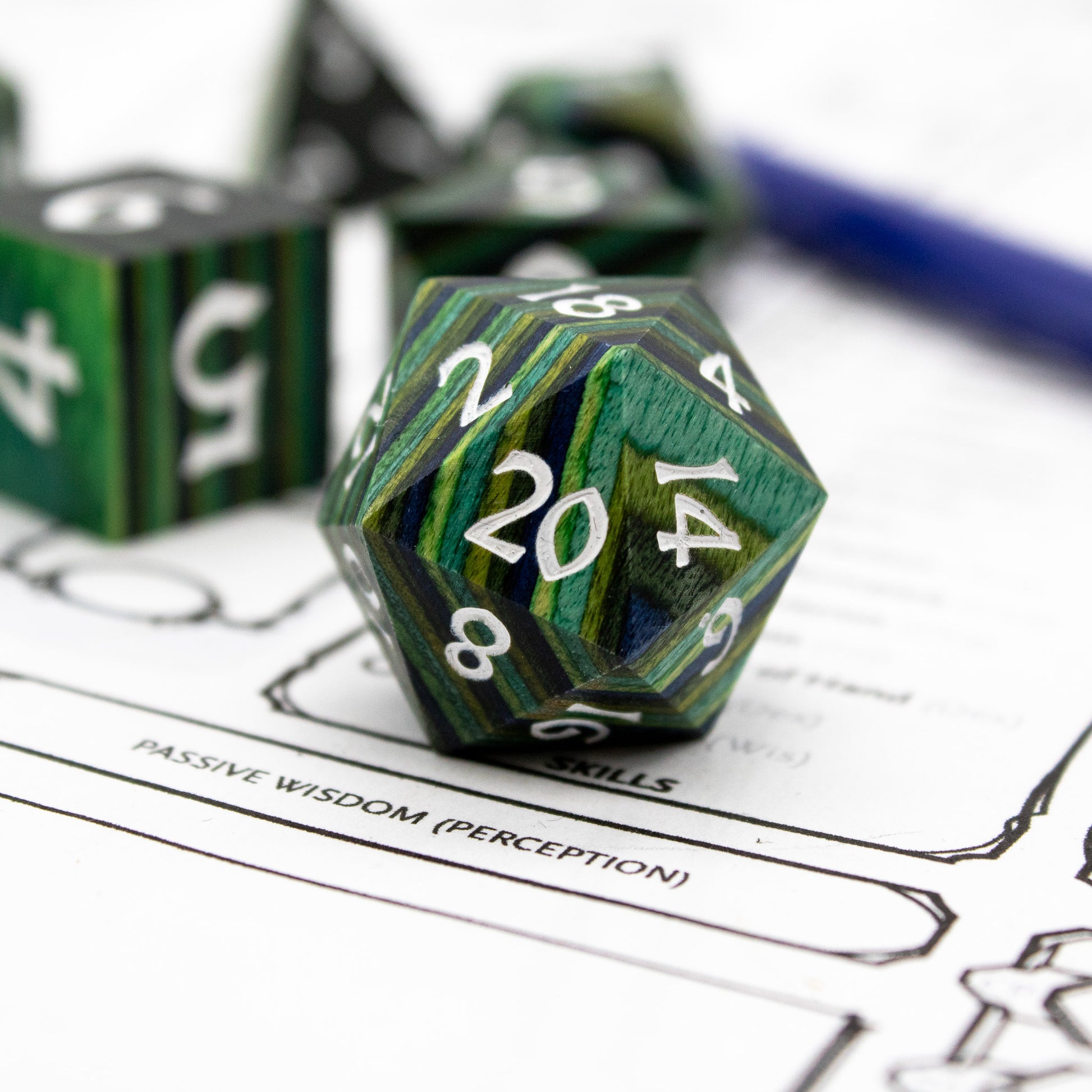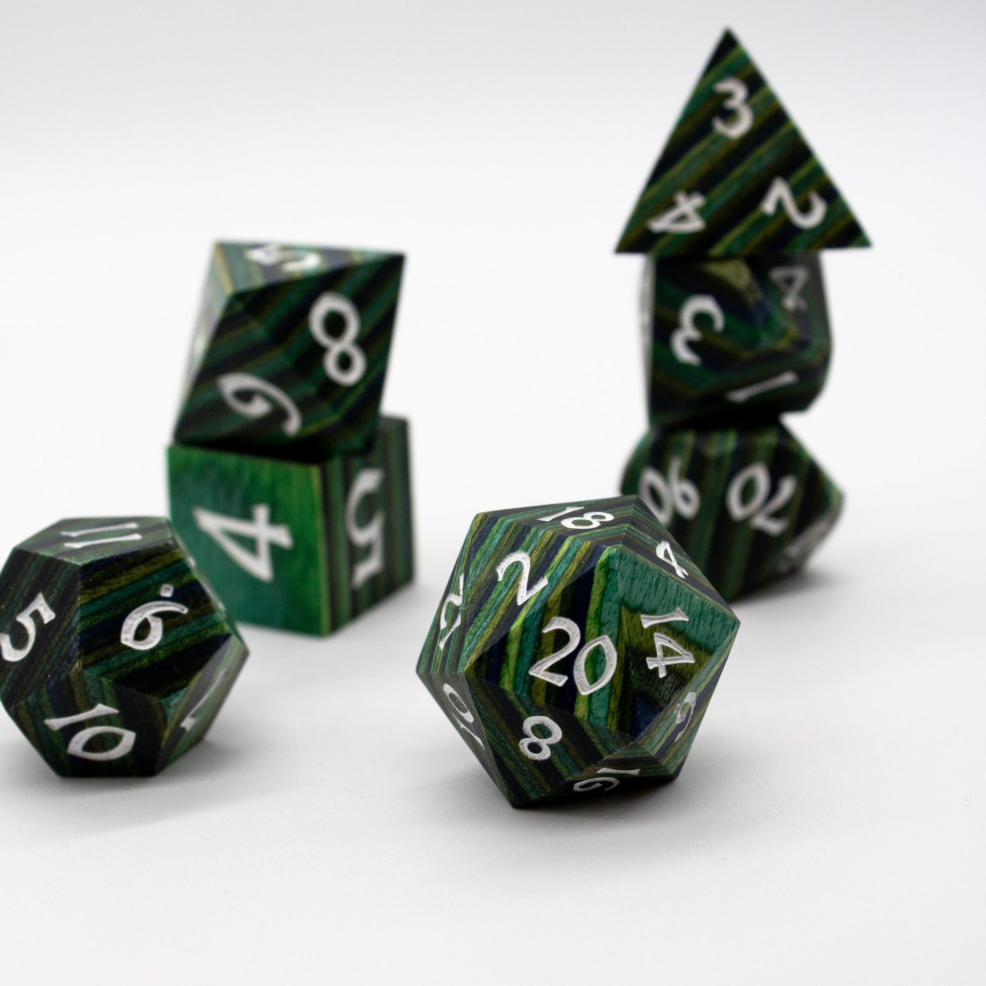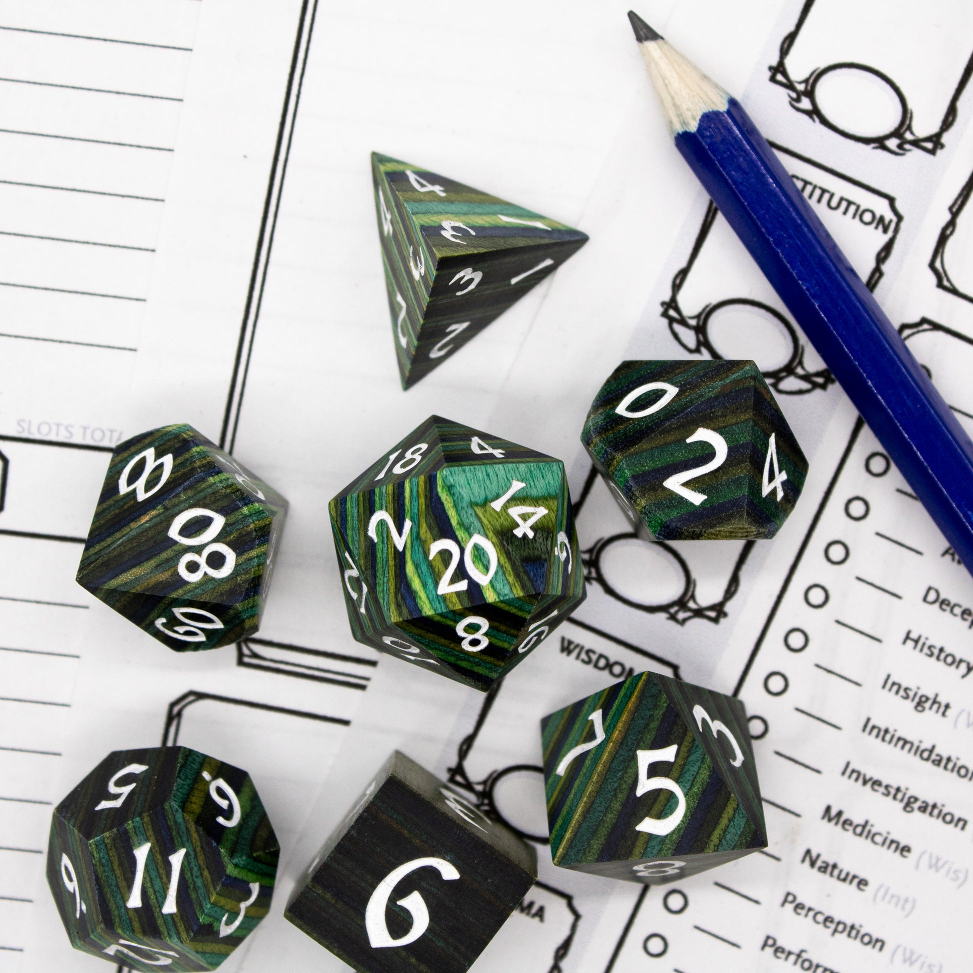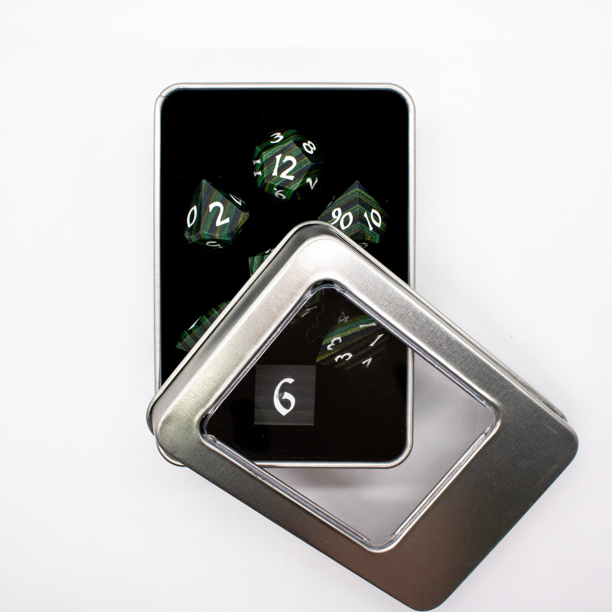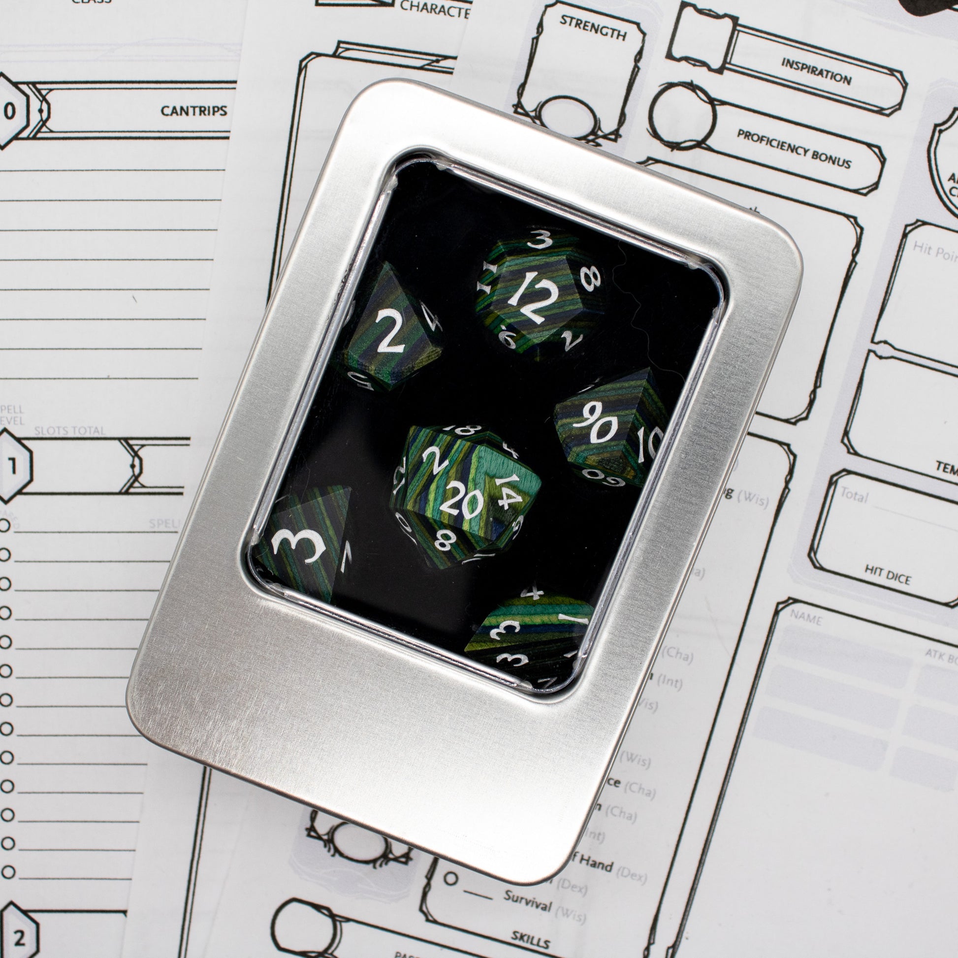 Seven-piece dice set comes with tin case to keep your wooden dice in great condition!
